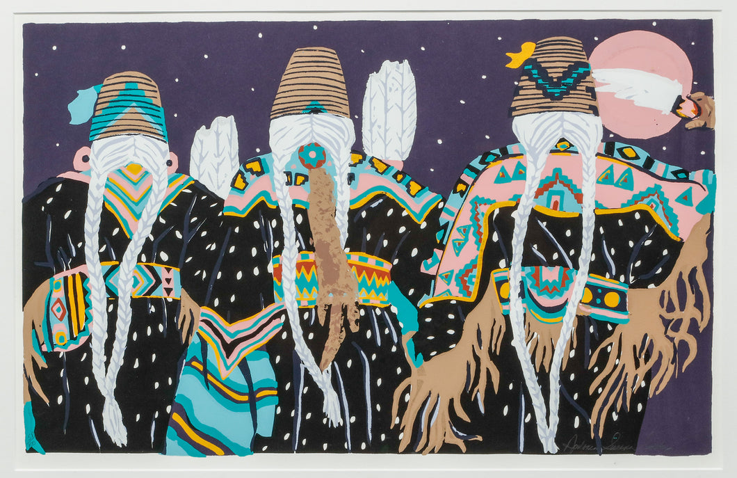 Apolonia Susana Santos’ paintings and serigraphs contain the dramatic and diverse landscape and sky of the High Desert. The elements of wind and water appear with vigor. Her artistic interpretation of Salmon, Coyote, Sun, and Moon express how strongly she was connected to her homelands. The contemporary interpretation of Native Peoples in traditional regalia preserves Indigenous ways and memory.