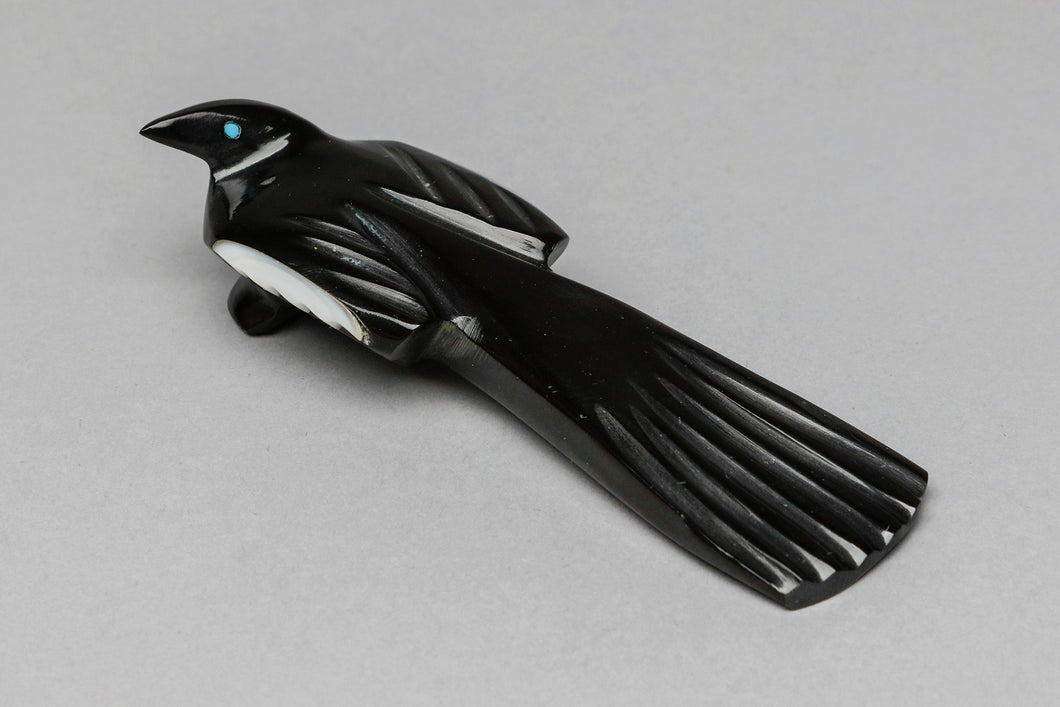 Calvert Bowannie is an established Zuni carver specializing in creating fetish carvings in highly polished jet, sometimes with inlays of mother of pearl or turquoise. His work is distinctive, with a unique stylized interpretation of birds and animals. He became famous for his raven’s with red berries in his mouth, and has since branched out to create traditional birds and animals native to Bew Mexico, but now creates Orca whales, penguins, and sharks that have become collector’s favorites.