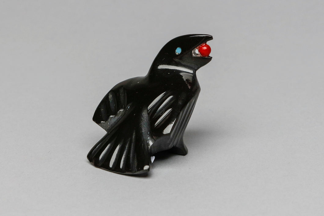 Calvert Bowannie is an established Zuni carver specializing in creating fetish carvings in highly polished jet, sometimes with inlays of mother of pearl or turquoise. His work is distinctive, with a unique stylized interpretation of birds and animals. He became famous for his raven’s with red berries in his mouth, and has since branched out to create traditional birds and animals native to Bew Mexico, but now creates Orca whales, penguins, and sharks that have become collector’s favorites.