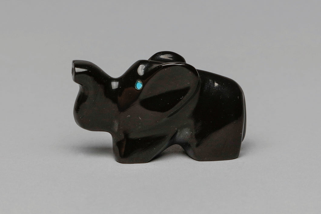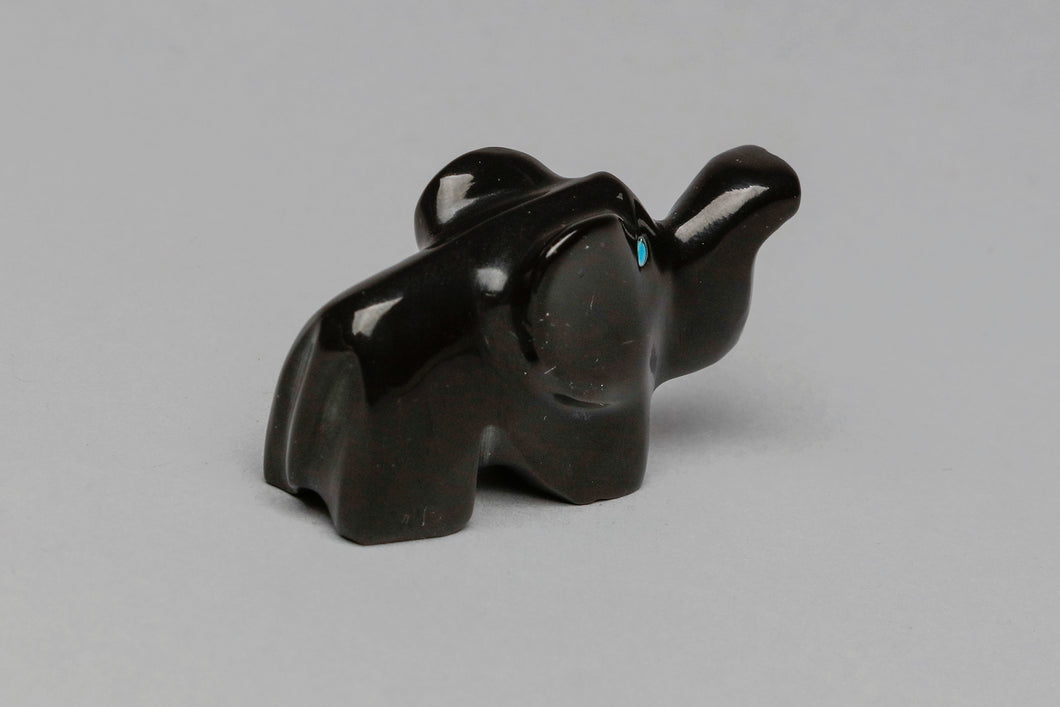 Calvert Bowannie is an established Zuni carver specializing in creating fetish carvings in highly polished jet, sometimes with inlays of mother of pearl or turquoise. His work is distinctive, with a unique stylized interpretation of birds and animals. He became famous for his raven’s with red berries in his mouth, and has since branched out to create traditional birds and animals native to Bew Mexico, but now creates Orca whales, penguins, and sharks that have become collector’s favorites. Calvert is an is an offspring of the renowned jeweler and fetish carving Panteah family from Zuni Pueblo, and he is married to Pedia Nastacio, who working with her husband, has become a fetish carver as well.