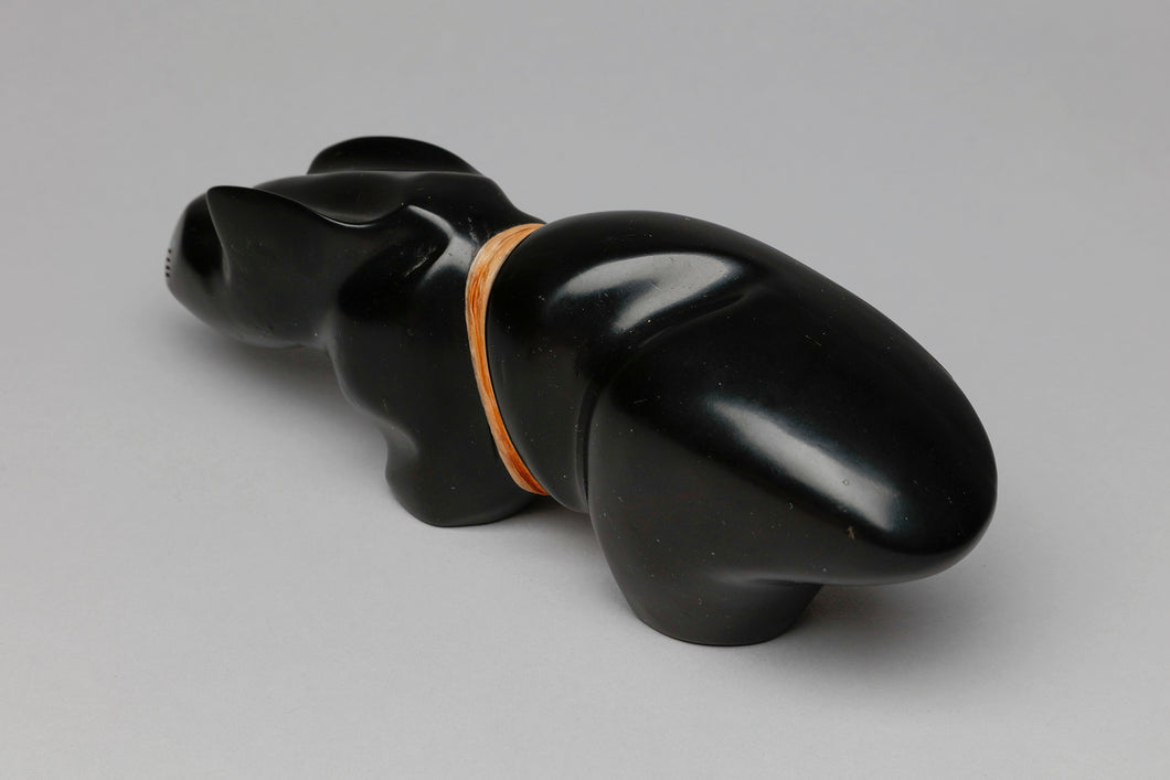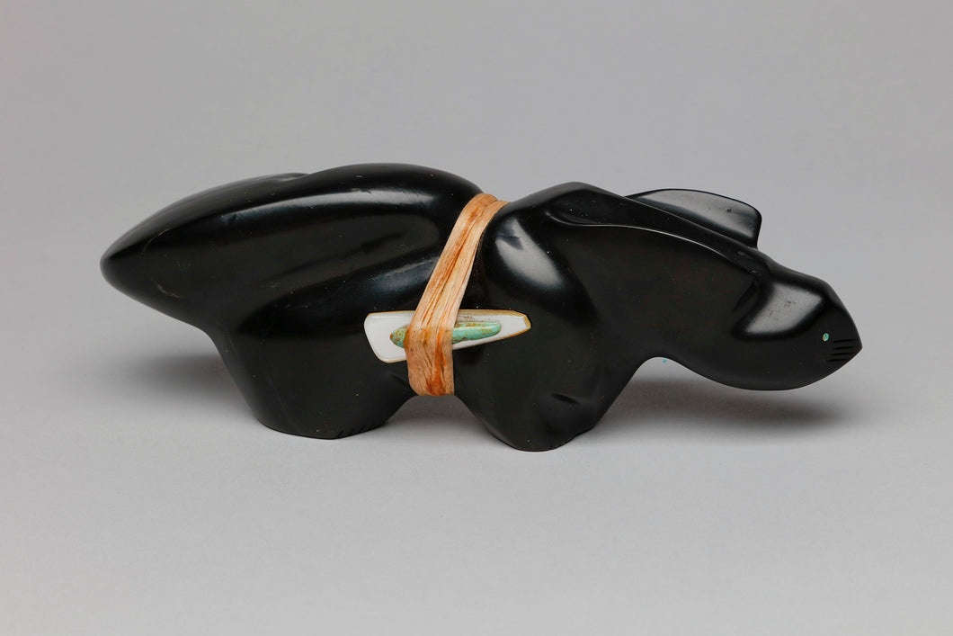 Large Mountain Lion Fetish Carving with Medicine Bundle by Dion Terrazas, Zuni Pueblo jet, mother of pearl, turquoise, leather cord 3” high x 8.5” long x 2” wide