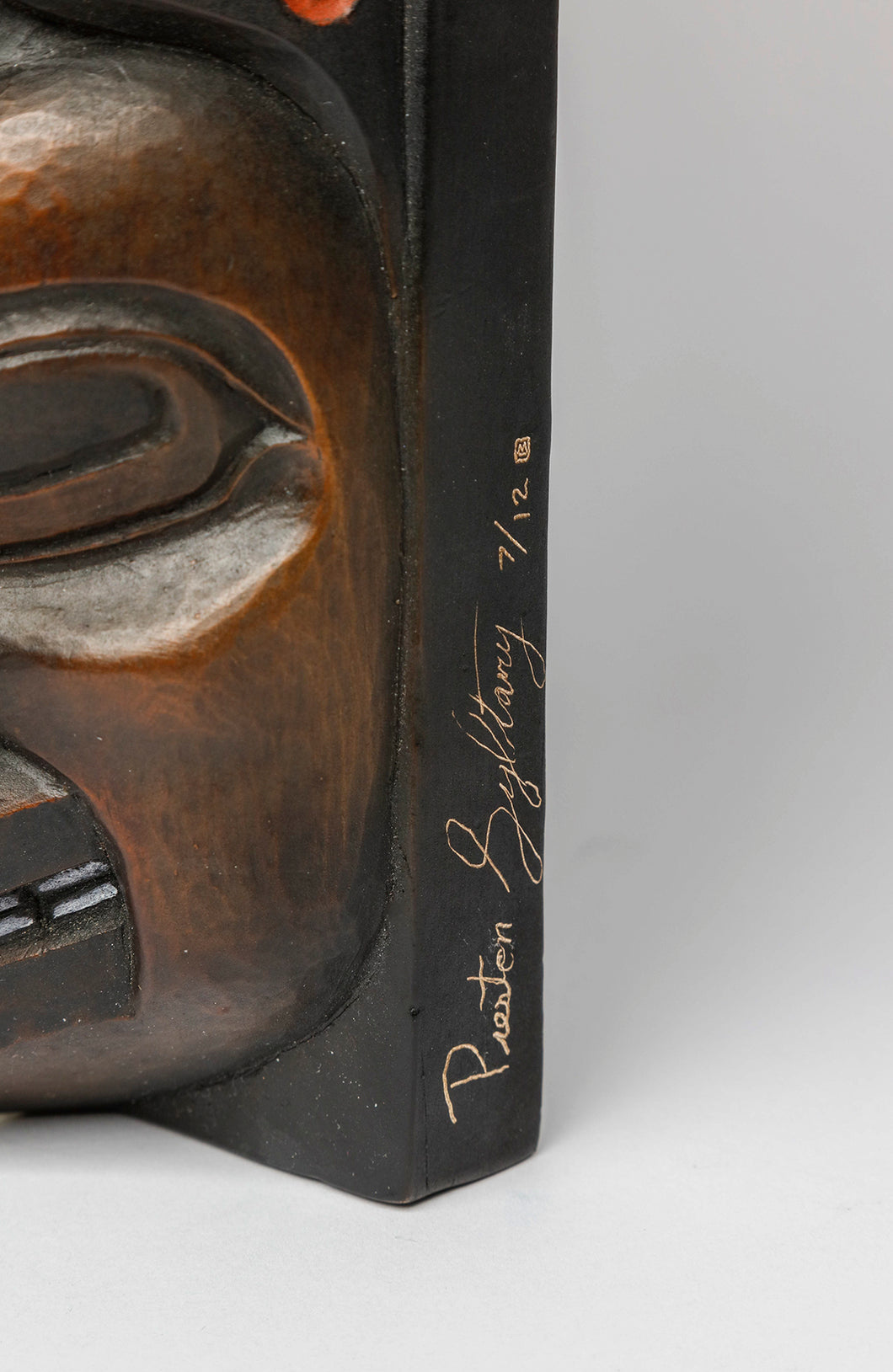 Preston Singletary is descended from the Tlingit Nation of southeastern Alaska. Singletary grew up in Seattle, and learned about his Tlingit heritage from his great grandmother, who was from Sitka, Alaska. Singletary's work is imbued with the sophisticated and vibrant artistic traditions of the Northwest Coast. He studies ancient designs made in traditional materials, such as cedar, shell, and bone, and he re-creates them in a modern, nontraditional mediums of glass and silkscreen prints.