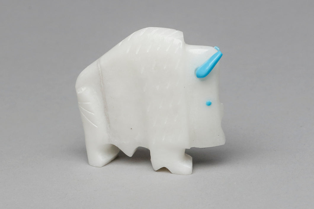Buffalo Fetish with Medicine Bundle by Todd Etsate, Zuni Pueblomarble, turquoise horns and eyes1 3/4” high x 1 3/4” long x 3/8” wide