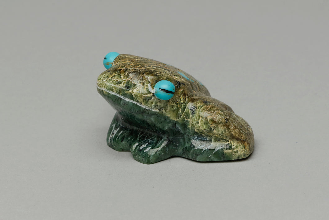 Frog Fetish Carving by Freddie Leekya, Zuni Puebloserpentine, turquoise and jet eyes1 1/2” high x 2” long x 1 1/2” wide