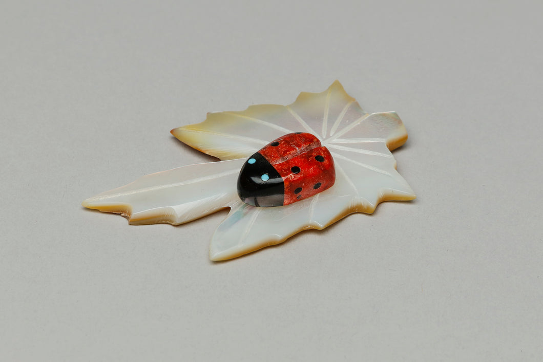 Lady Bug on Leaf Carving by Cheryl Beyuka, Zuni Pueblomother of pearl, apple coral, jet, turquoise3/8” high x 2 1/4” long x 1 1/2” wide
