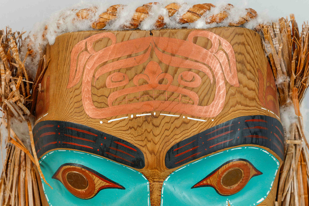 red cedar, hand hammered copper, feathers, cedar bark, pigment